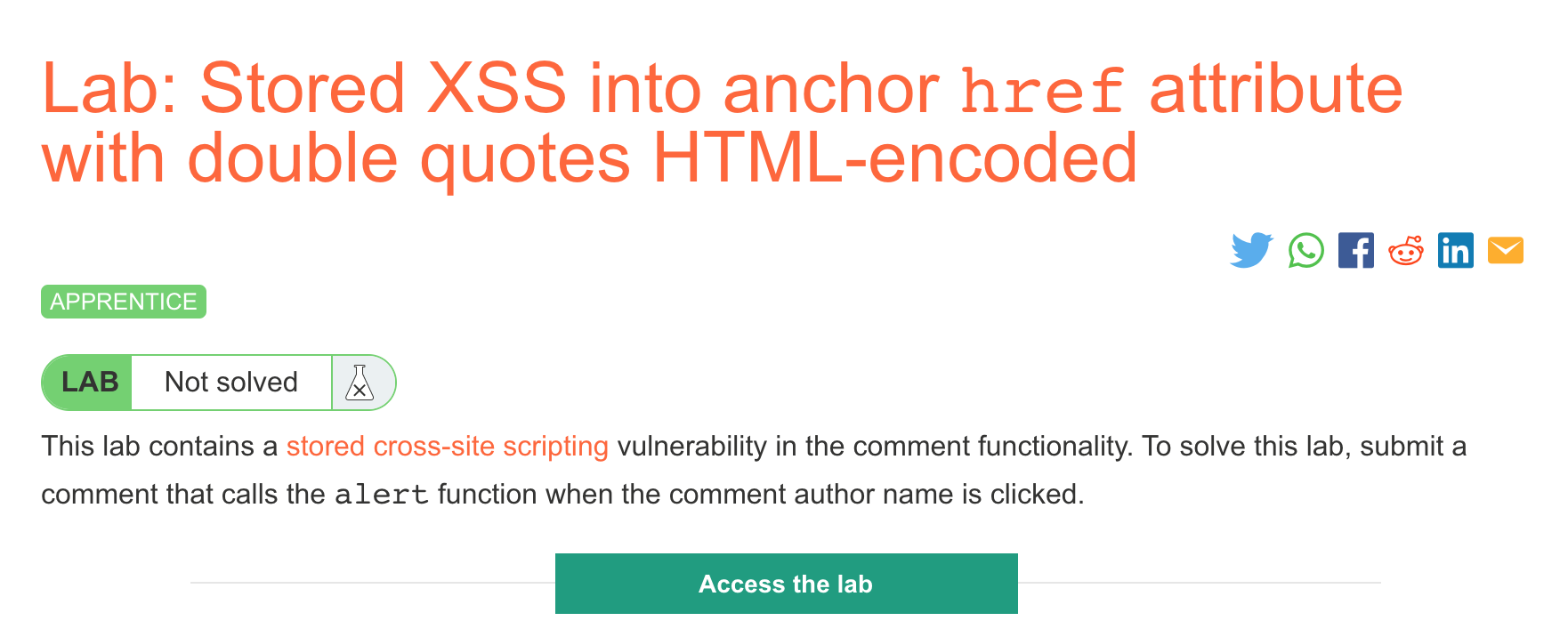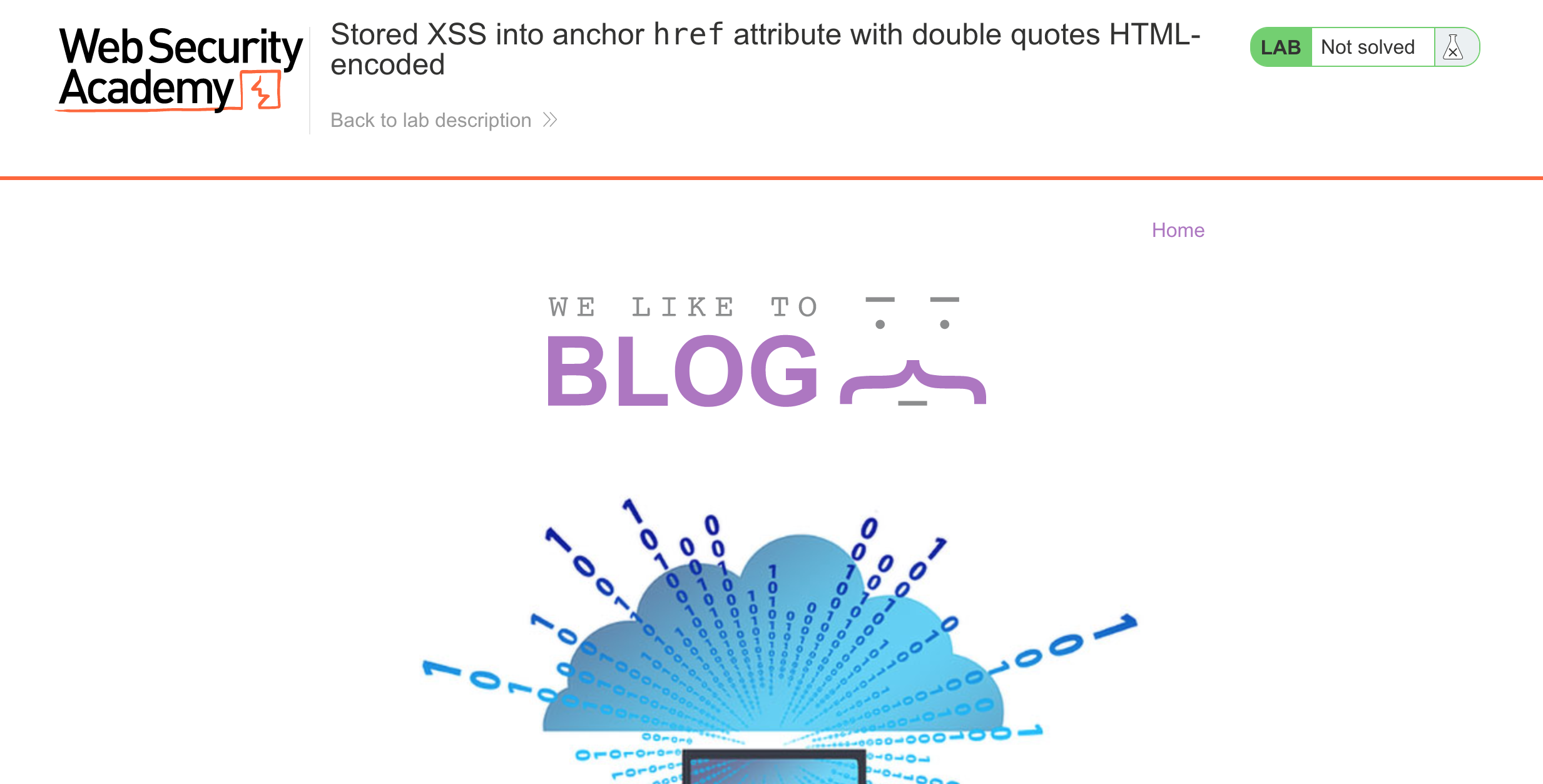 After logging in, head over to the lab, located at https://portswigger.net/web-security/cross-site-scripting/contexts/lab-href-attribute-double-quotes-html-encoded. You can find this through the Academy learning path list, or linked within the Stored XSS blog post.