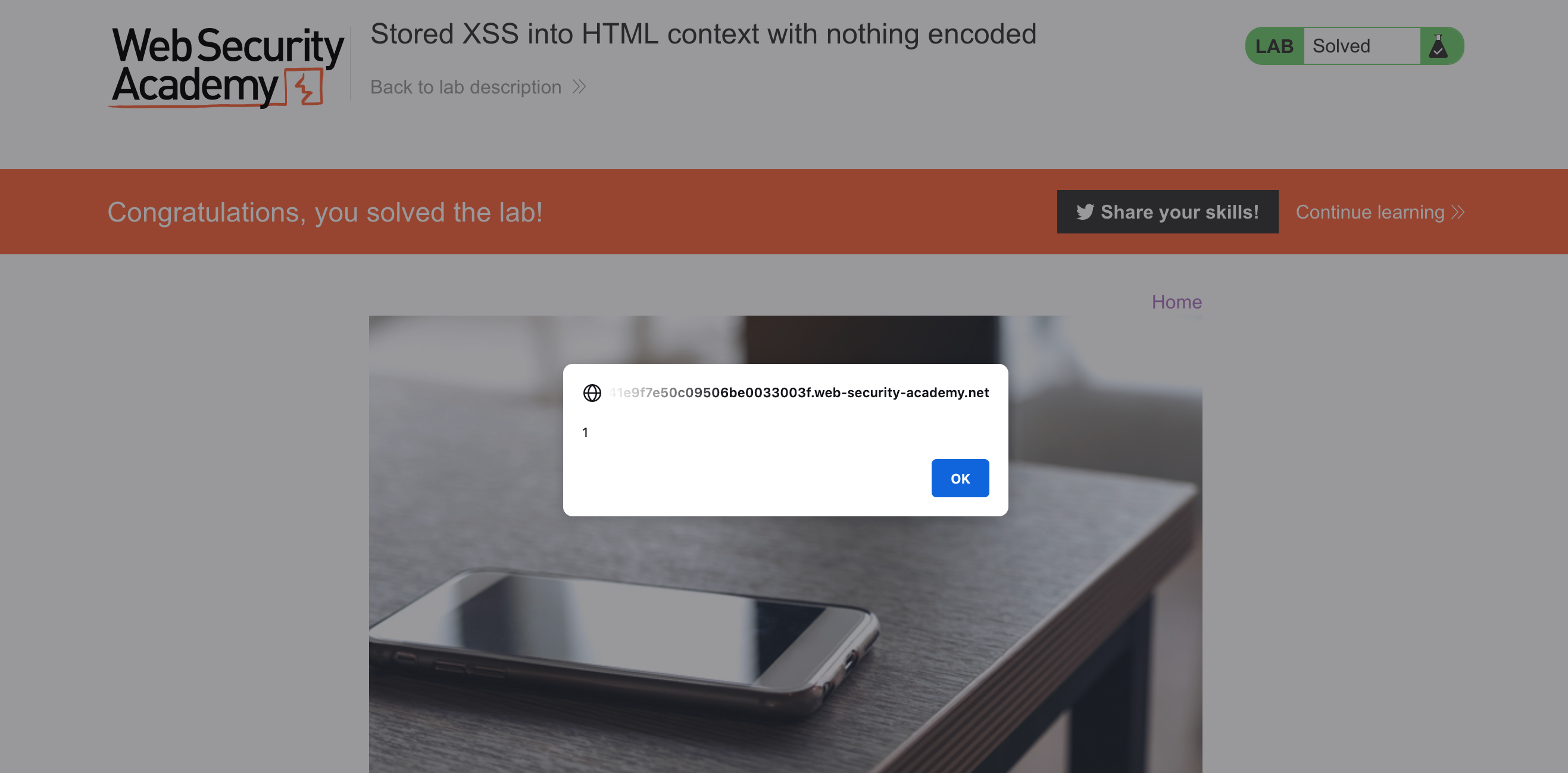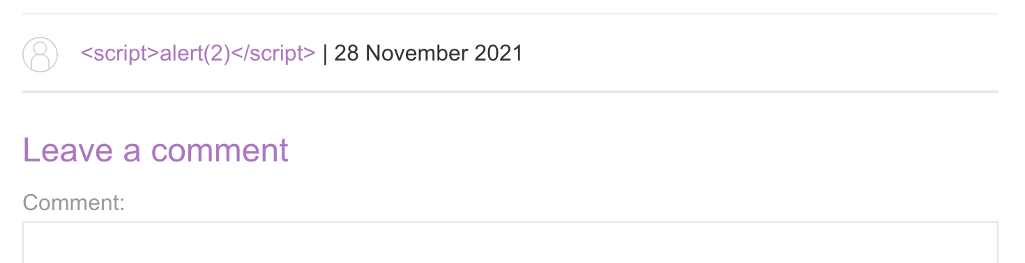 We’ve got an alert, and with that, we’ve solved the lab. You can scroll down to see that our username field was not vulnerable (and is being displayed as normal text) but our comment field is blank, since it was executed as Javascript. In other words, the comment field was vulnerable.