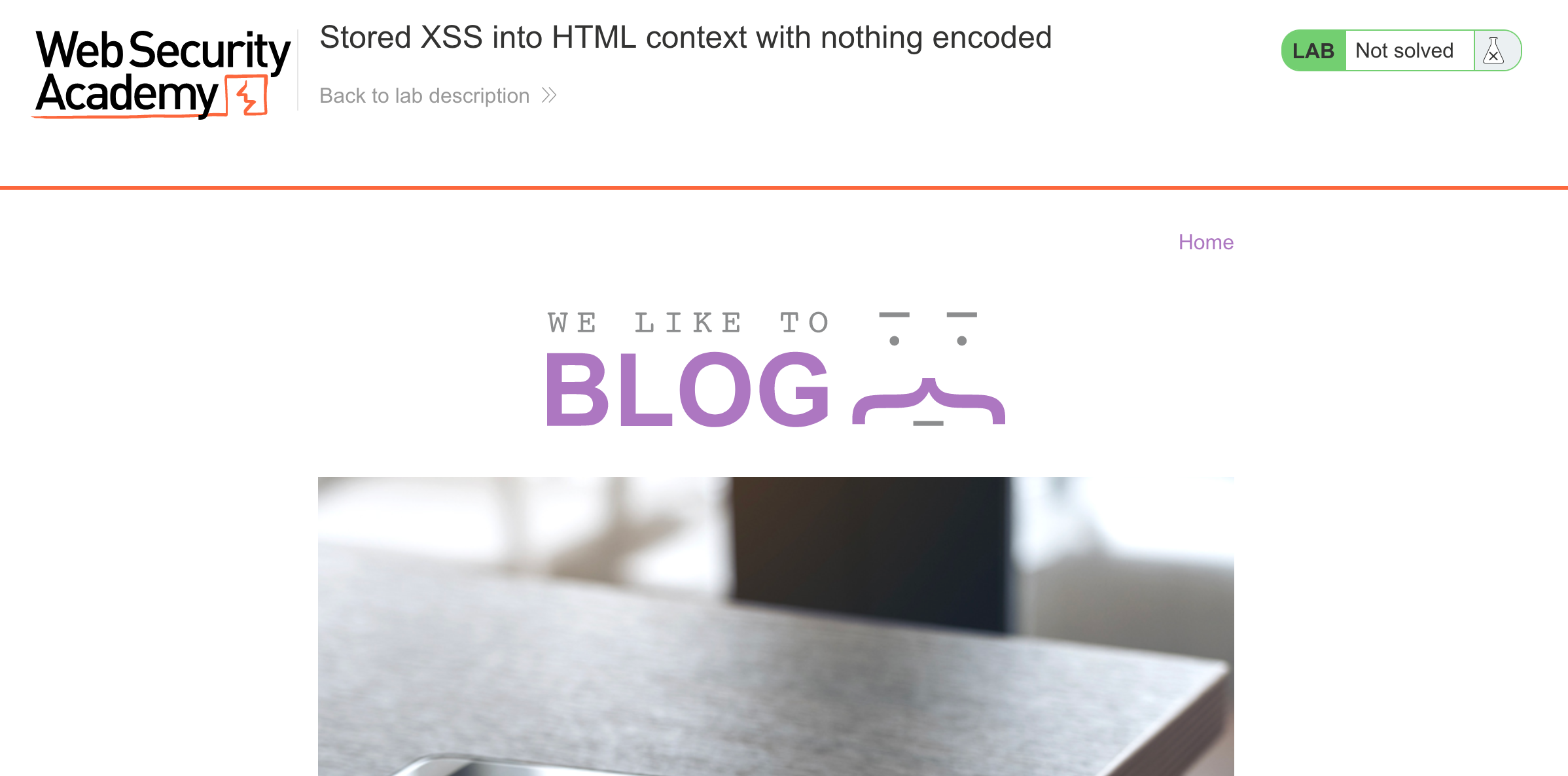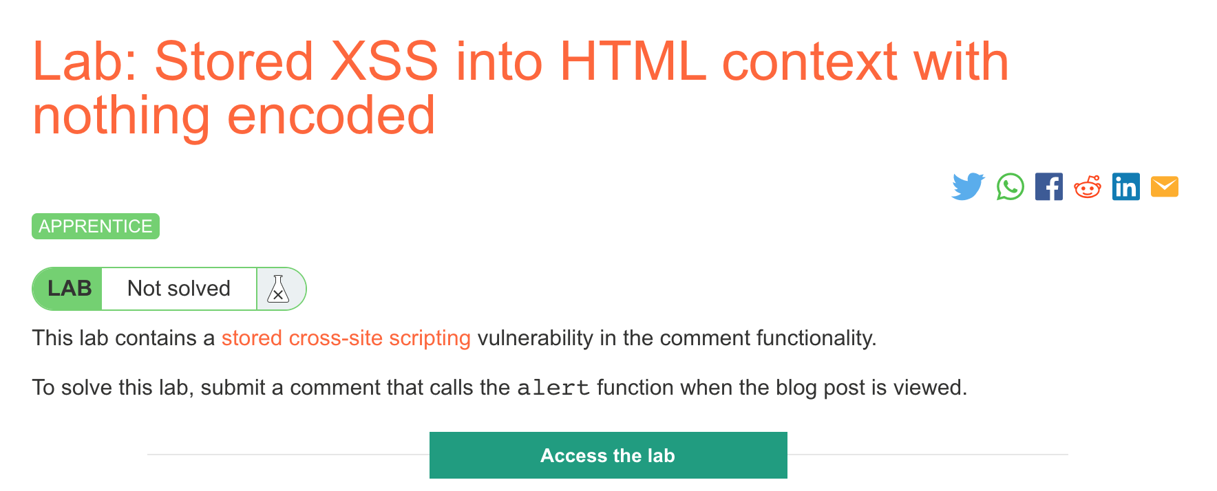 After logging in, head over to the lab, located at https://portswigger.net/web-security/cross-site-scripting/stored/lab-html-context-nothing-encoded. You can find this through the Academy learning path list, or linked within the Stored XSS blog post.