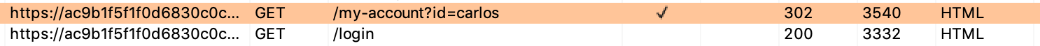 The first request (to /my-account?id=carlos) returns a 302, and then the second request is for /login, which matches the behavior we saw in the browser.