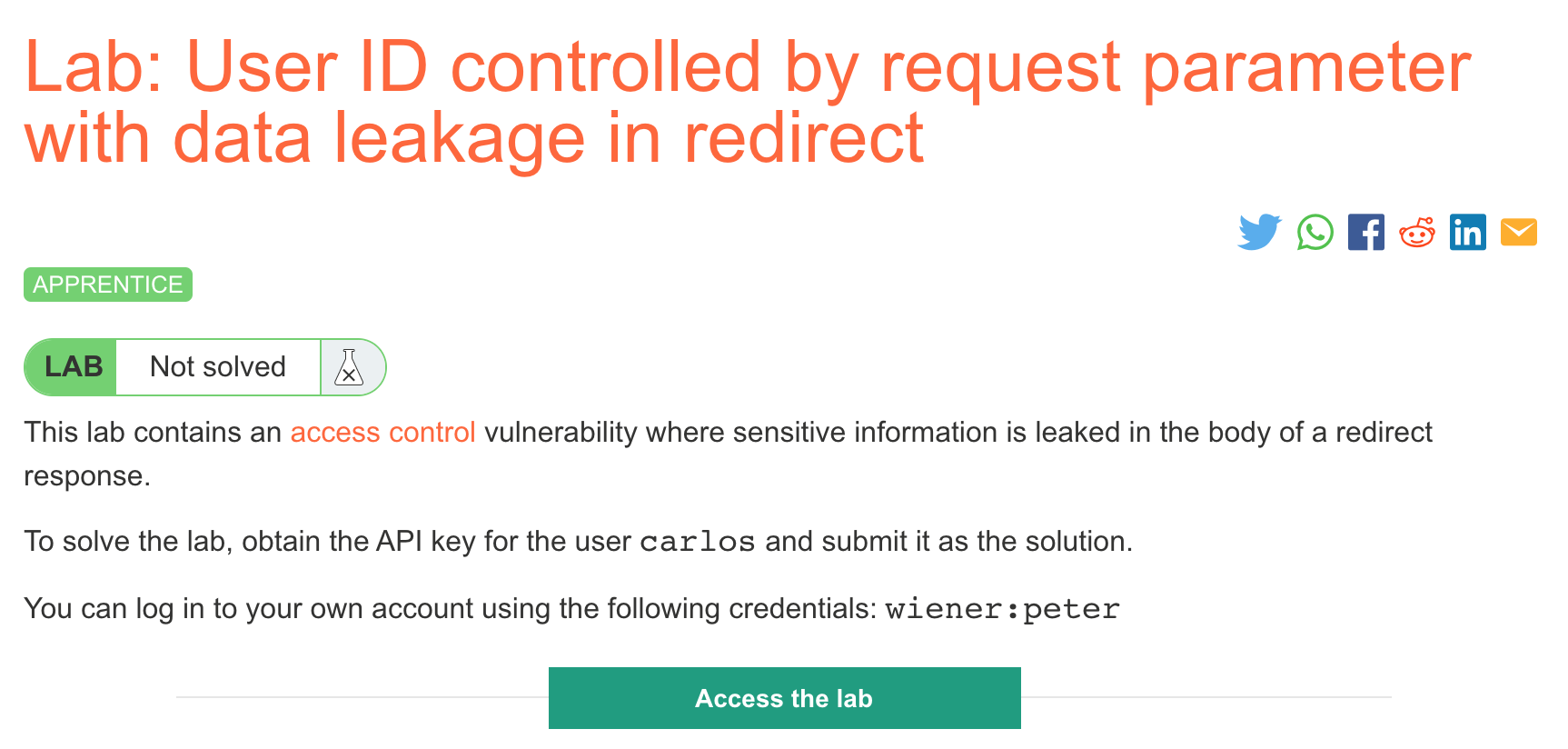 You’ll need a Portswigger Academy account before you get started. Log in and then view the lab at https://portswigger.net/web-security/access-control/lab-user-id-controlled-by-request-parameter-with-data-leakage-in-redirect. This is accessible from the “all labs” view or the access control blog post.