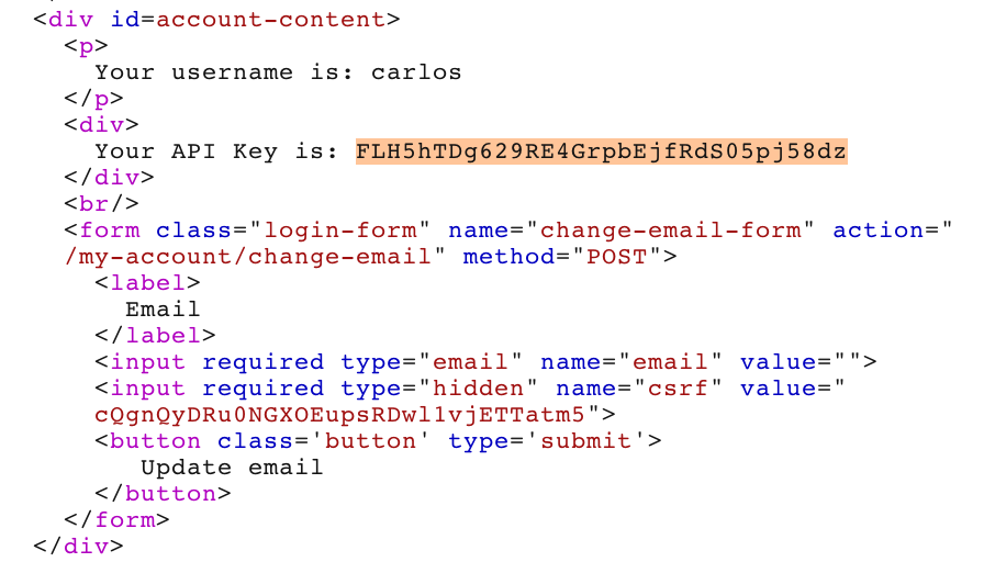 If we scroll down, however, we see that the page with Carlos’ information was loaded before the user was redirected, so that anyone who’s able to intercept the redirect can steal Carlos’ API key: