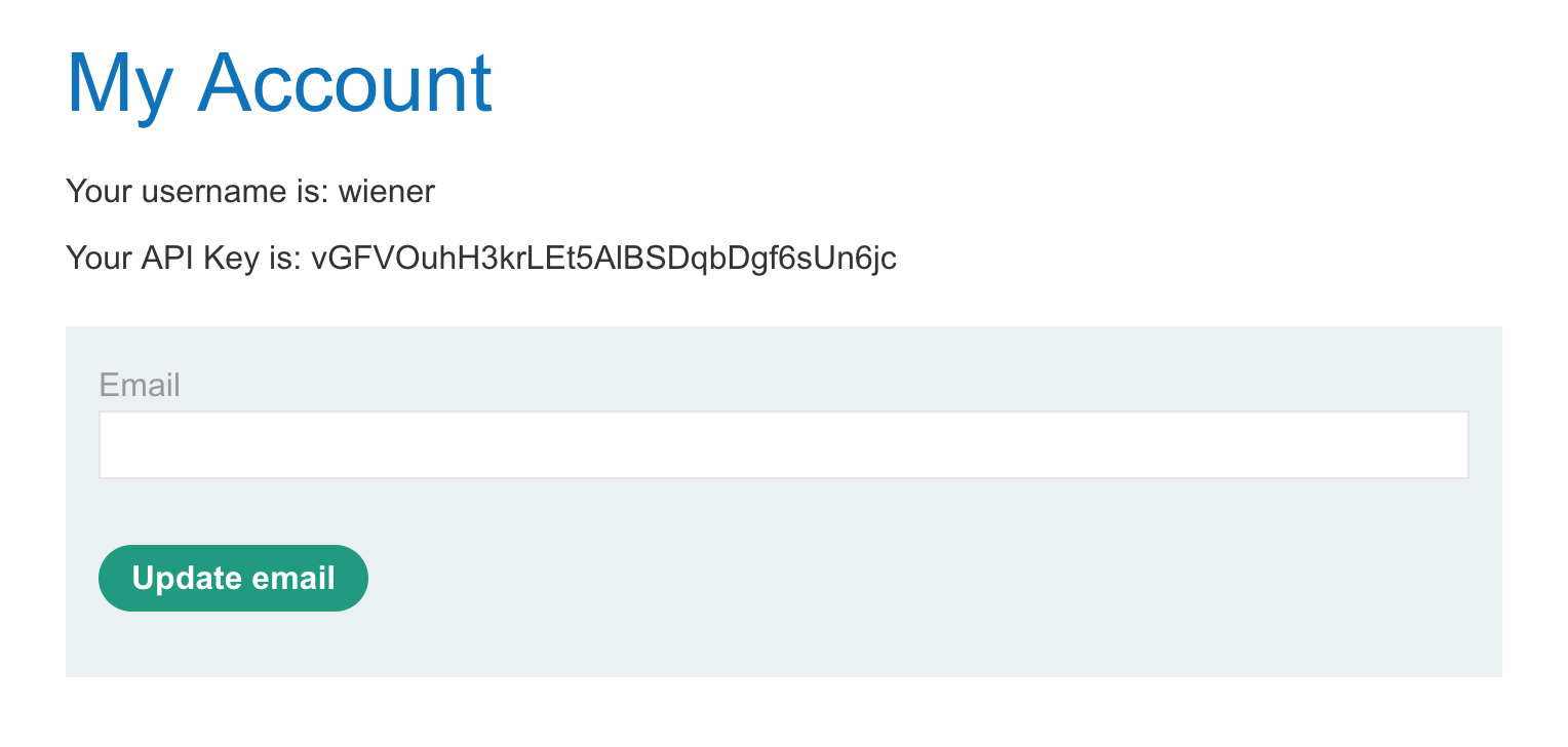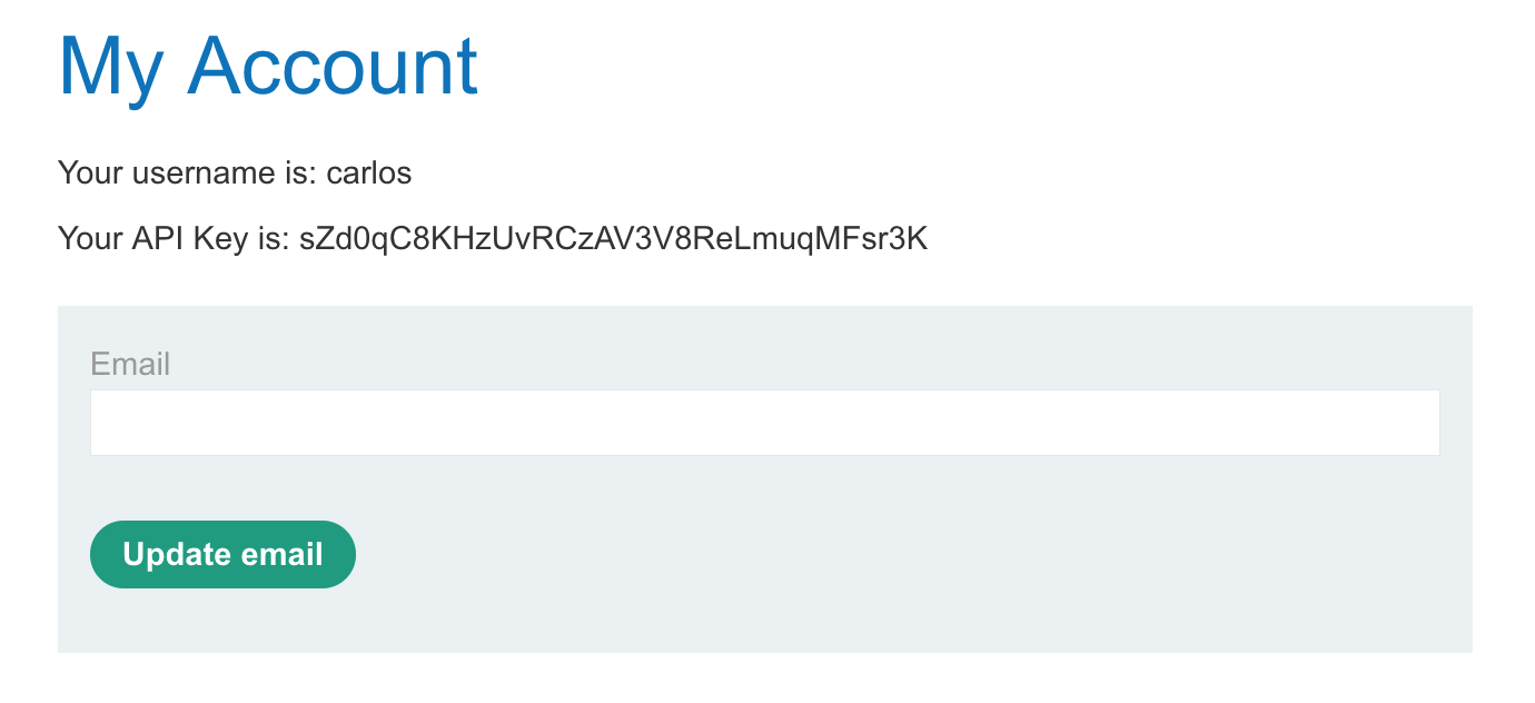 Similar to previous labs, we’ll need to get Carlos’ API key in order to get credit for solving this lab. Unlike the last lab, users are identified with a GUID (long random string; a globally unique ID) instead of just their names, at least when talking to the API.