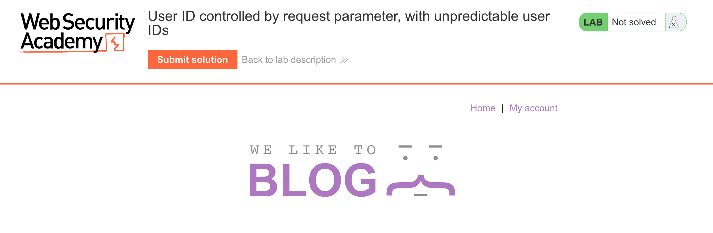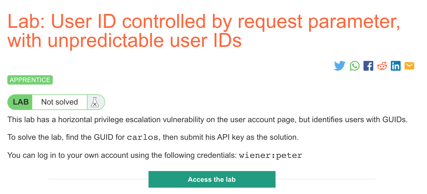 You’ll need a Portswigger Academy account before you get started. Log in and then view the lab at https://portswigger.net/web-security/access-control/lab-user-id-controlled-by-request-parameter-with-unpredictable-user-ids. This is accessible from the “all labs” view.