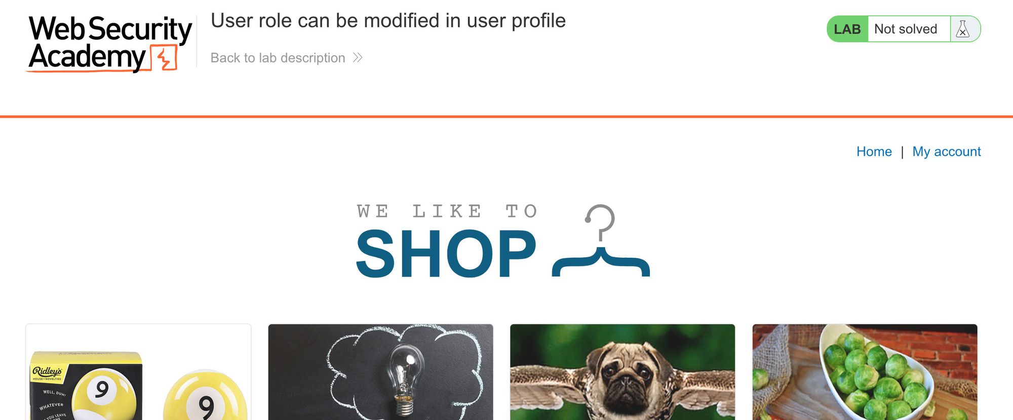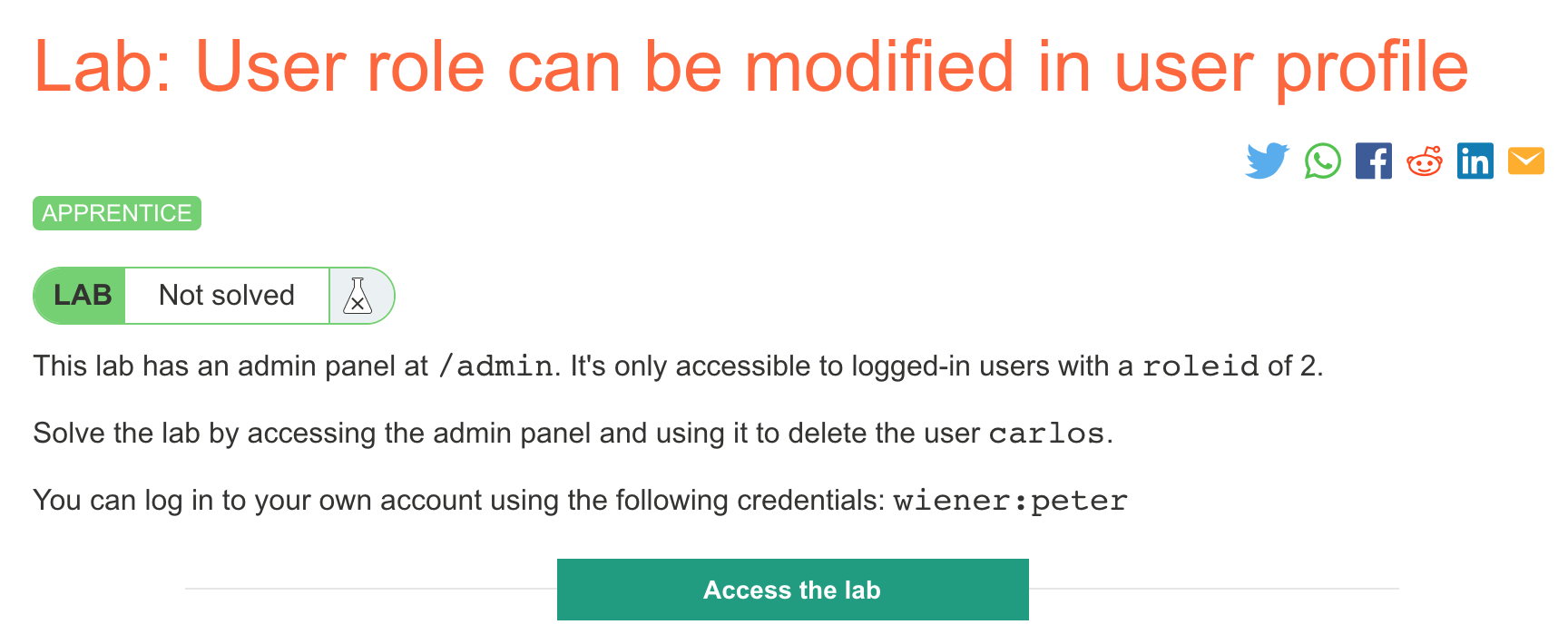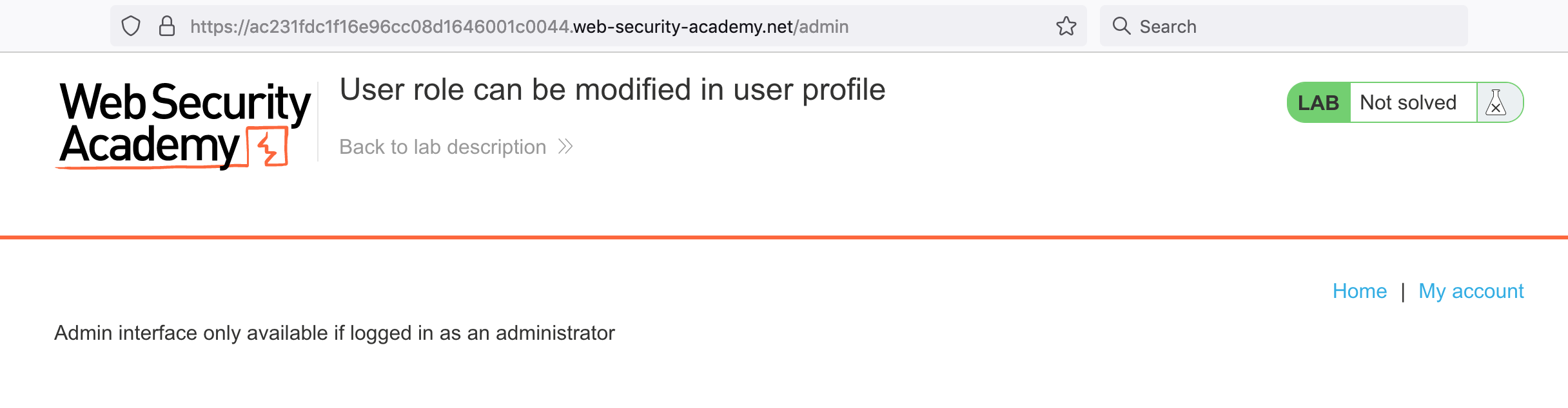 You’ll also need a Portswigger Academy account. Log in and then view the lab at https://portswigger.net/web-security/access-control/lab-user-role-can-be-modified-in-user-profile. This is accessible from the “all labs” view.