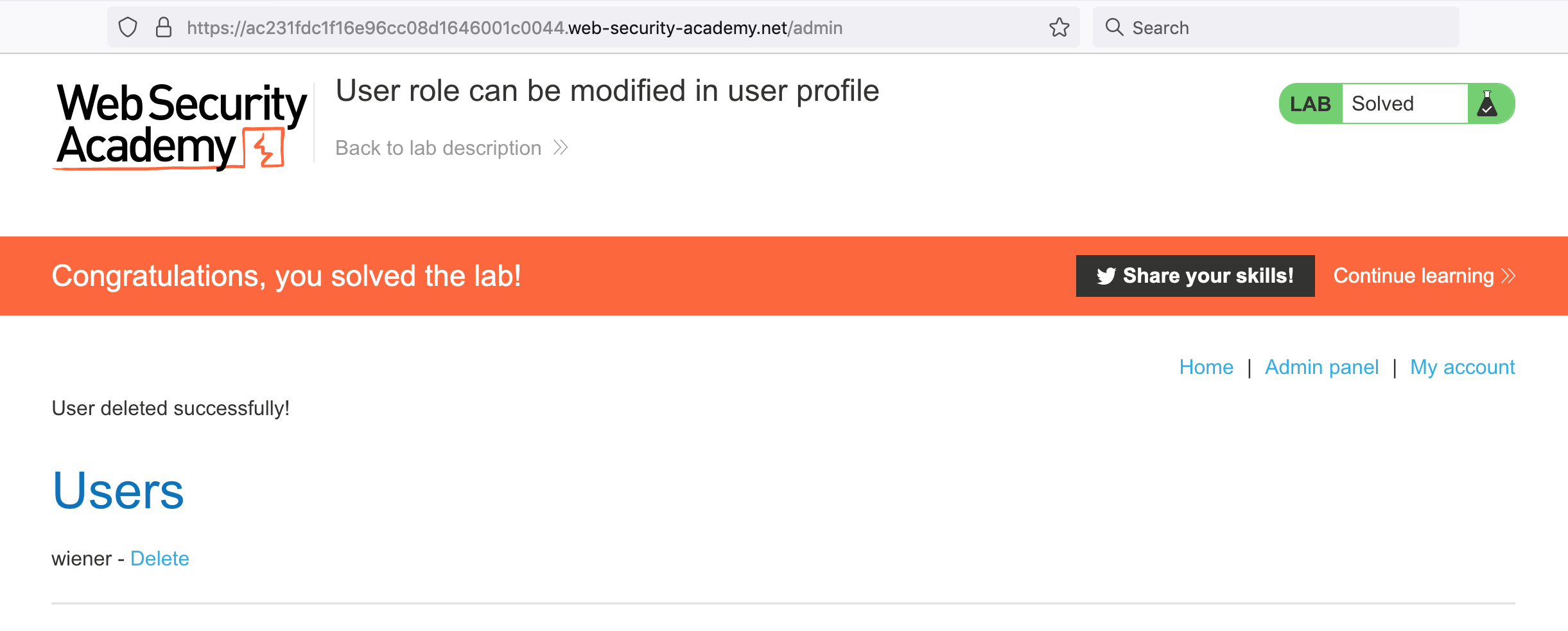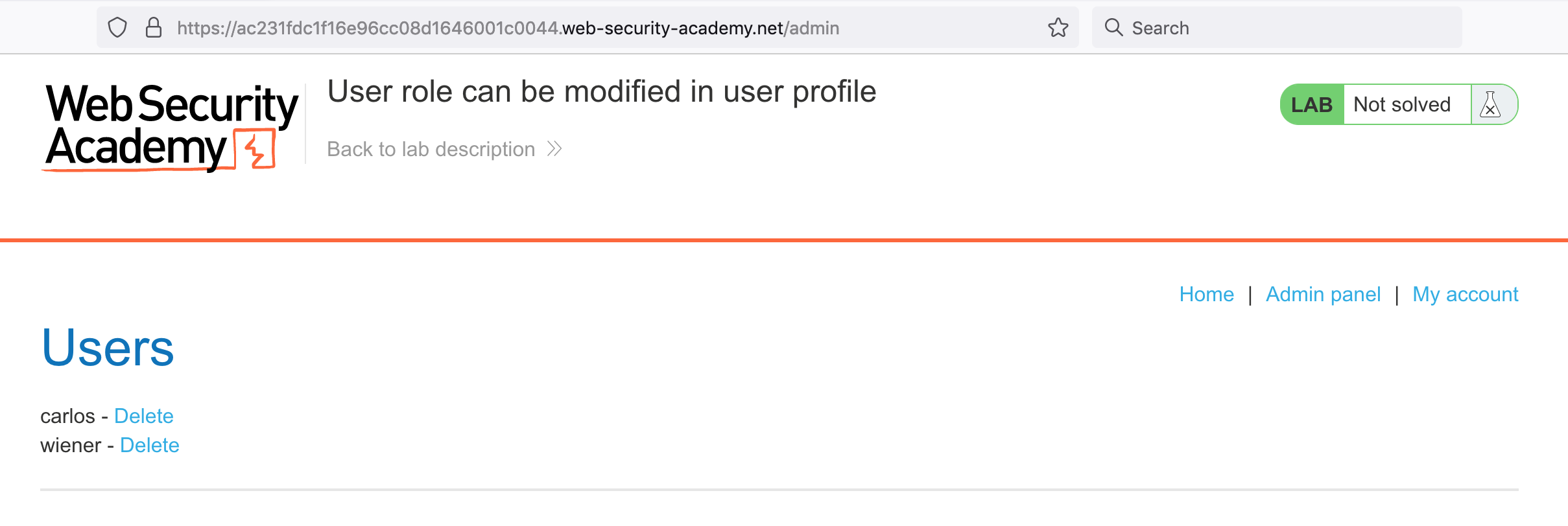 We were able to change our roleid and get admin access. Let’s delete the carlos user to complete the lab: