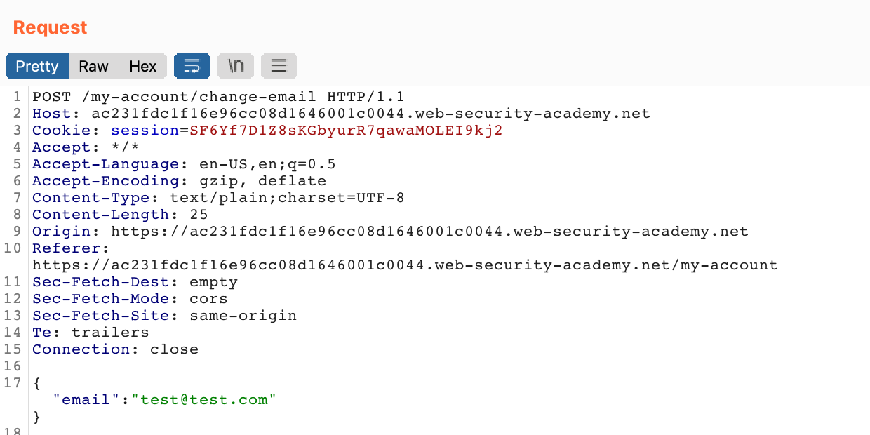 With Burp Suite open and your proxy running, make a email change request by typing in a valid email format (test@test.com) and clicking Update Email.