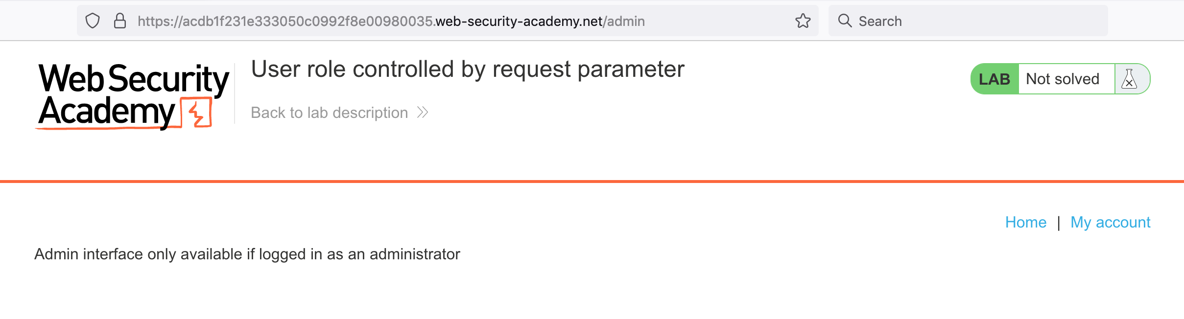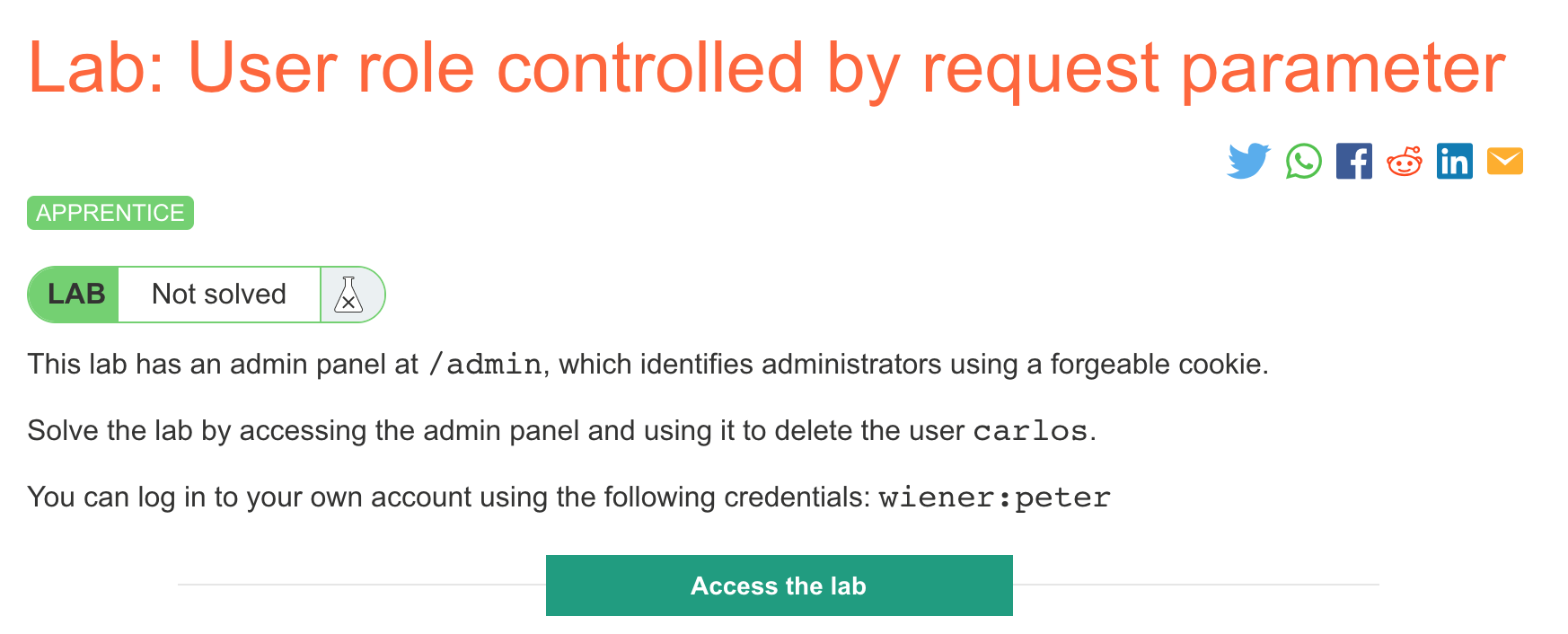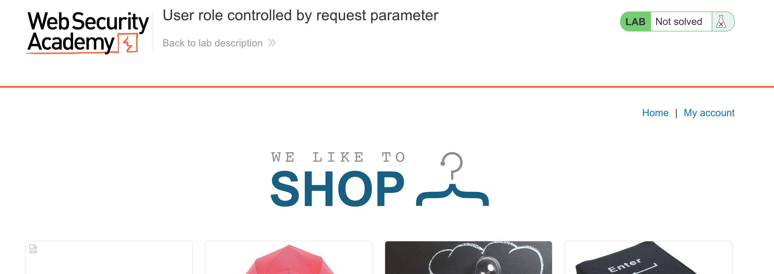 Before we get started, you’ll need a Portswigger Academy account. Log in and then view the lab at https://portswigger.net/web-security/access-control/lab-user-role-controlled-by-request-parameter. This is accessible from the “all labs” view.