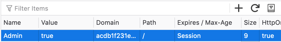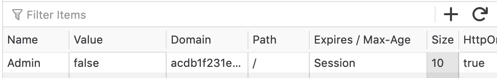 Open up Dev Tools and go to Storage (Firefox) or Application (Chrome/others) to view cookies. We see that there’s a admin cookie with value set to false.
