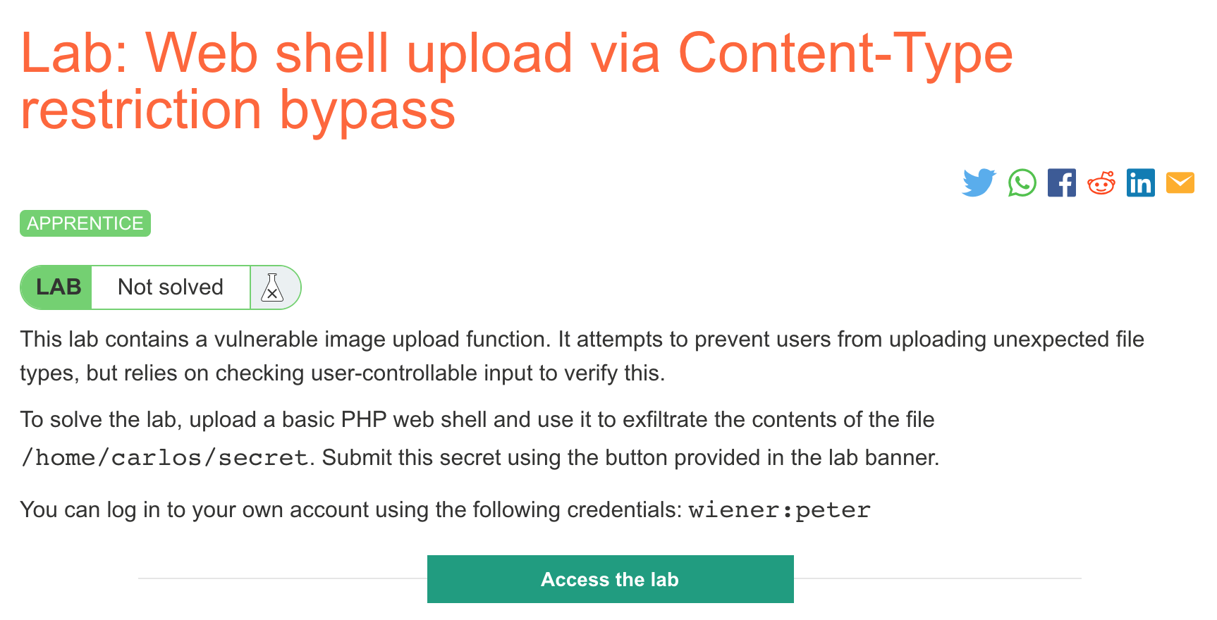 You’ll need Burp Suite set up before following this walkthrough. You’ll also need a Portswigger Academy account. Once logged into your account, view the lab at https://portswigger.net/web-security/file-upload/lab-file-upload-web-shell-upload-via-content-type-restriction-bypass. This is accessible from the “all labs” view or from the File Upload page.